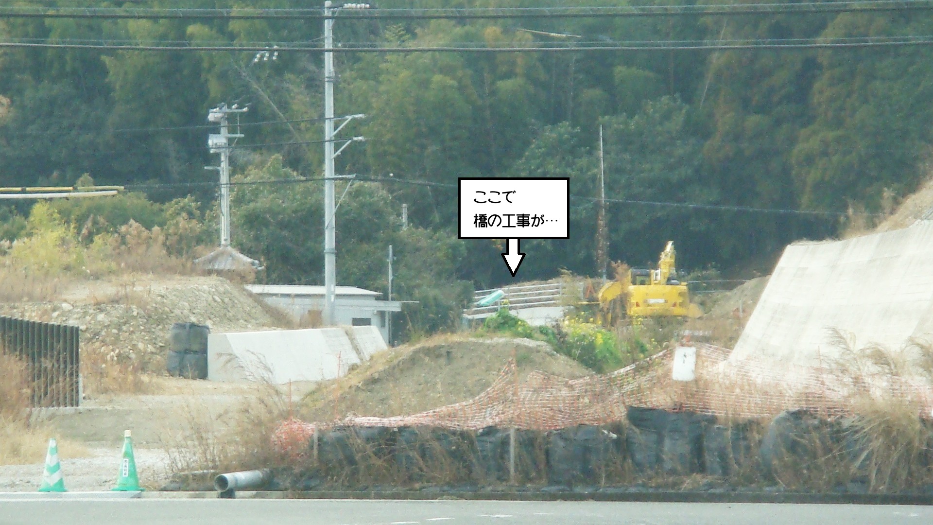 向こう側で橋の工事が行われているようですが、完成できそうにない…