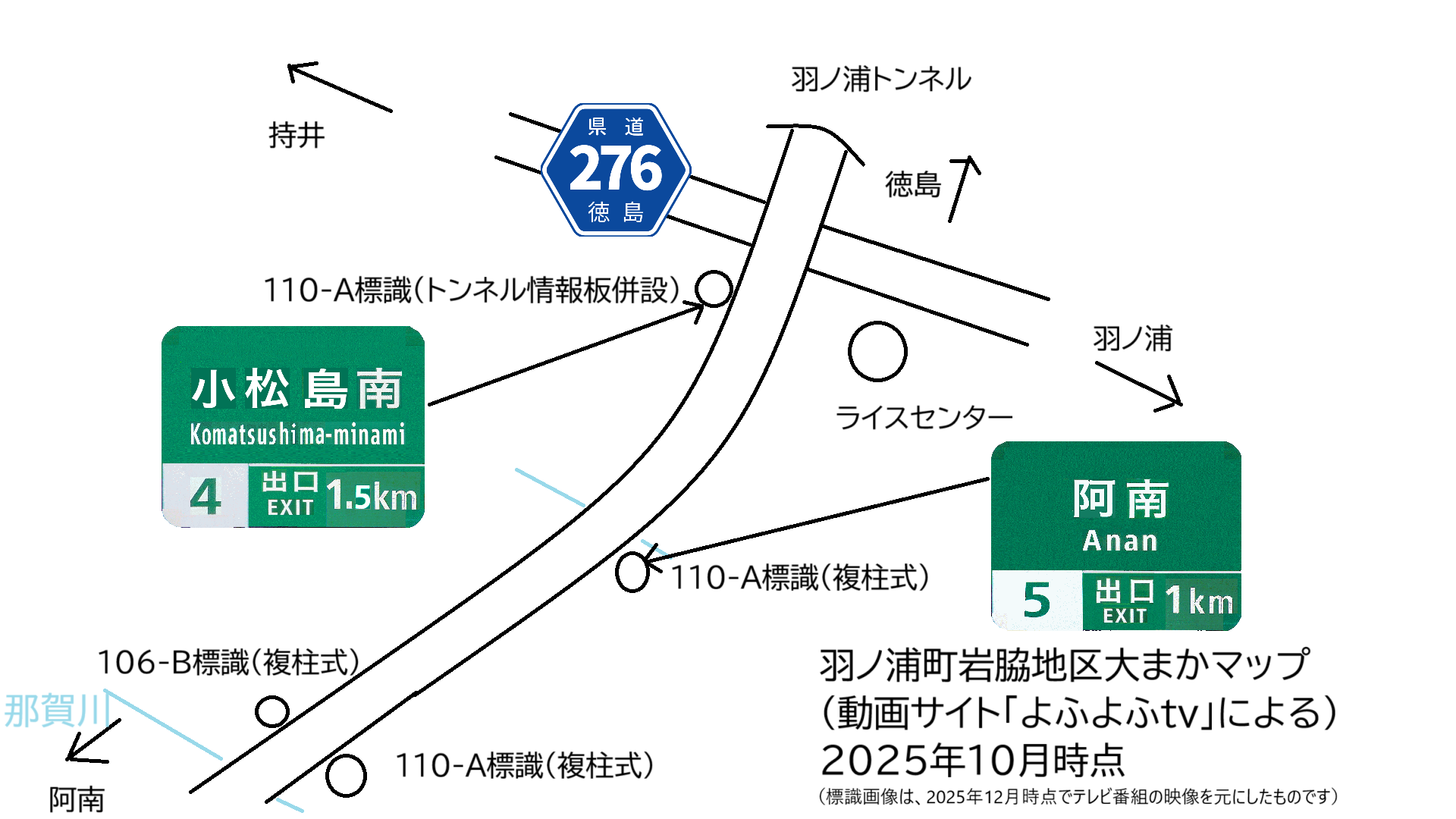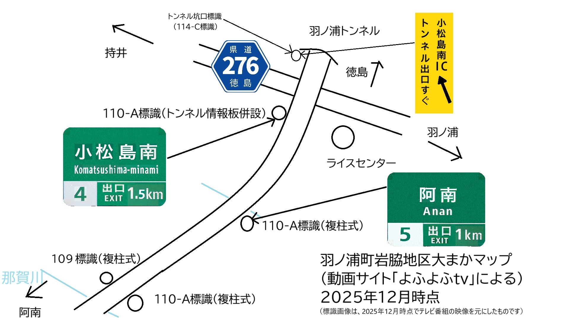 羽ノ浦町岩脇の2025年12月時点の状況です。出口案内標識(112-A標識)トンネル入口標識(114-C標識)も設置されました。路上にライン引きもありました。
