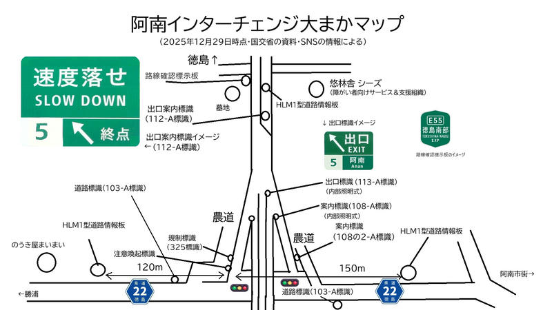 小松島南インターチェンジの出口予告標識の位置は予想通りでした。