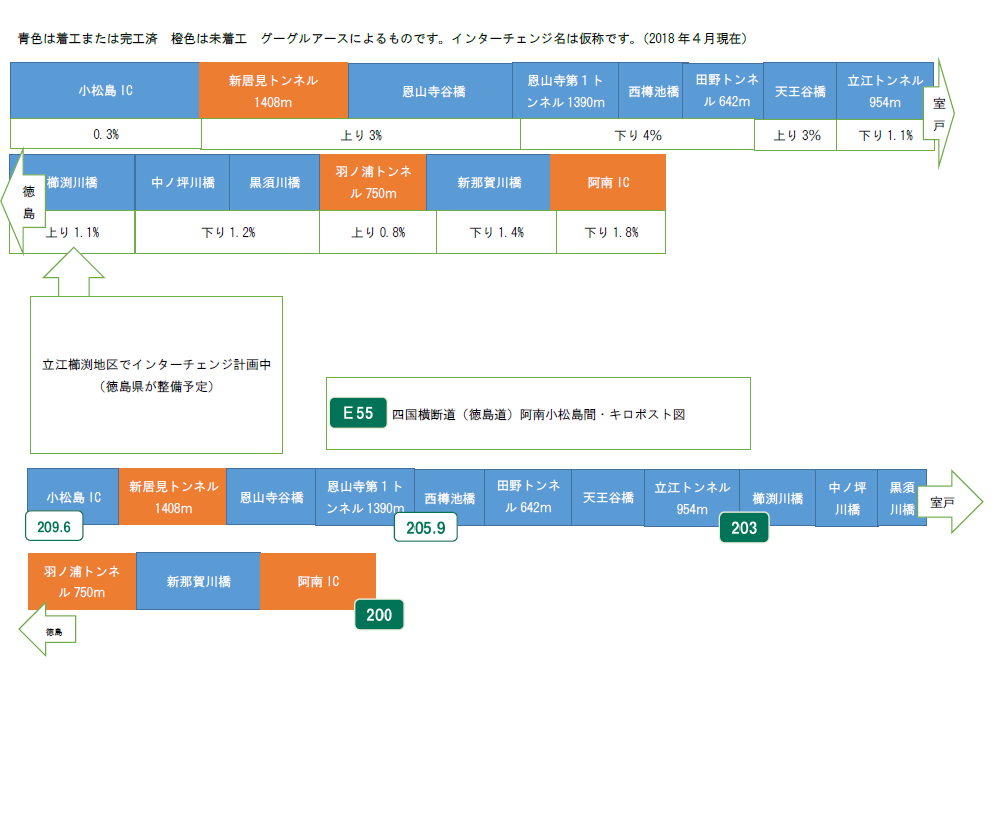 2018年4月時点の四国横断道(徳島道という名称になる予定)阿南-小松島間の進捗状況です。